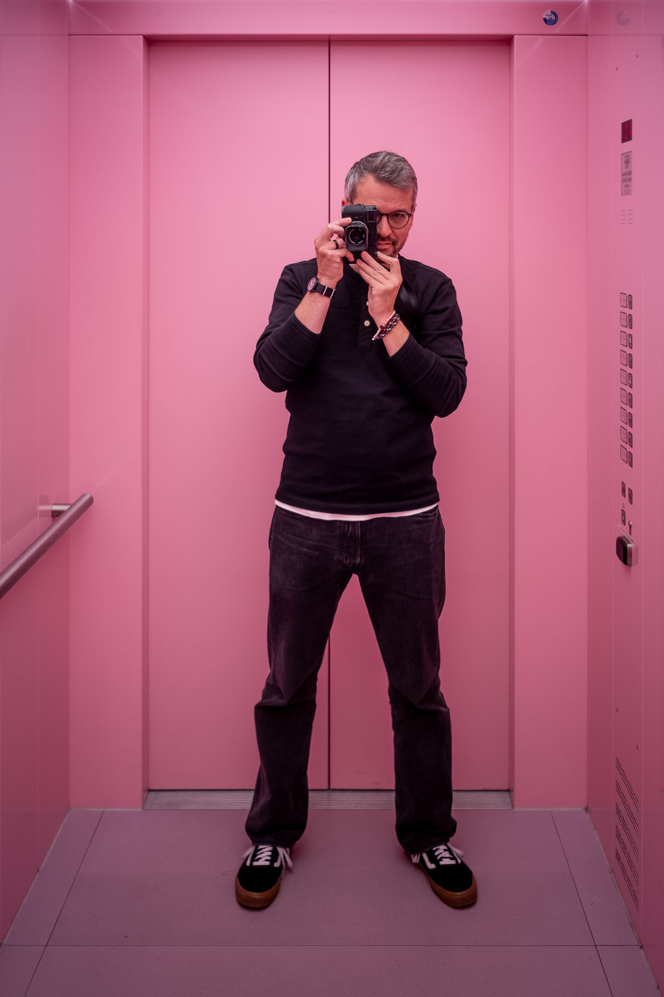 Observing color, mirror selfie, same elevator.