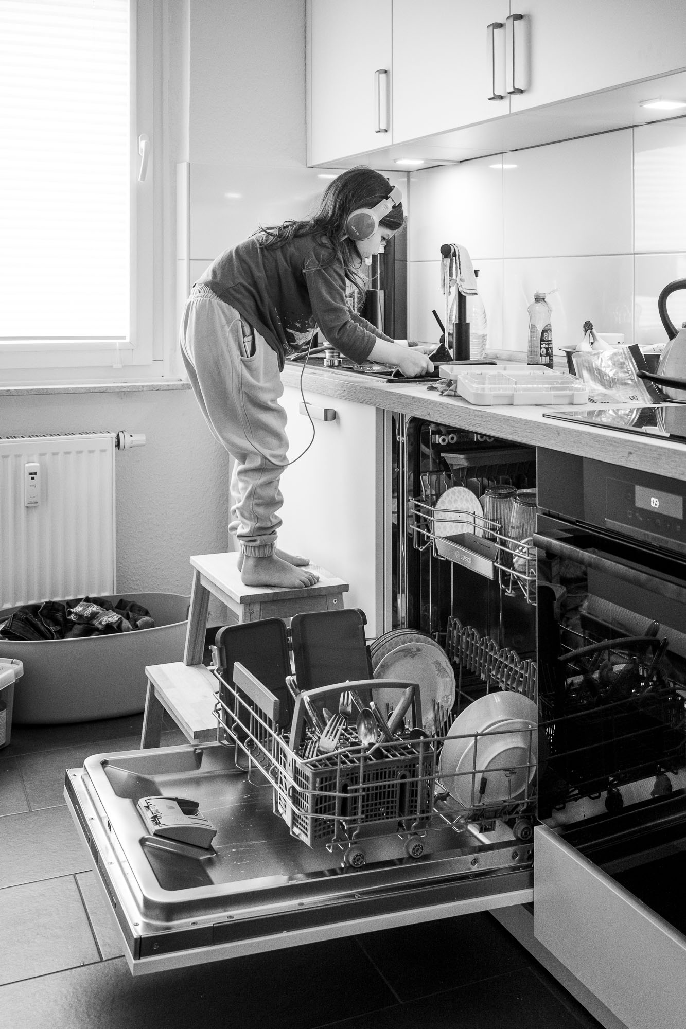 Suvi was helping with the dishes today, while listening to some music (as I usually do when doing household chores) and Lumi spent the afternoon at the sewing machine, which is her favorite pastime recently.